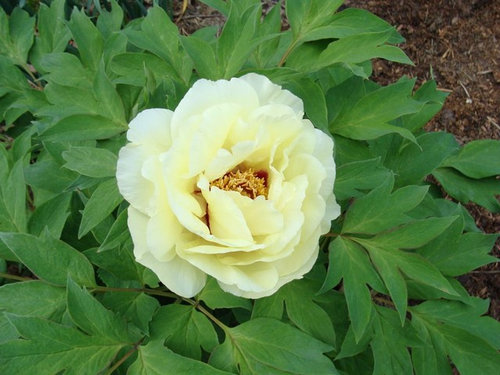Paeonia suffruticosa Renkaku Japanese Tree Peony. This plant like Paeonia lemoinei Alice Harding is sometimes sold as Kinshi Bears large double lemon yellow mildly fragranced flowers.